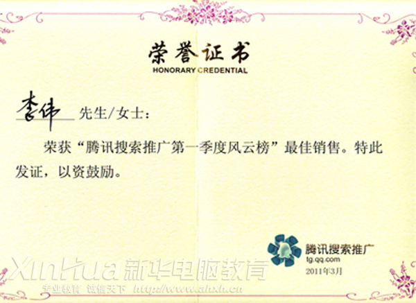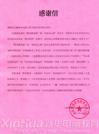 安徽新华电脑专修学院08届学生李伟,在腾讯搜索推广第一季度风云榜评比中以优异的业绩荣获“最佳销售”称号,发来感谢信以表达对新华为他们输送优秀人才的感激之情。
