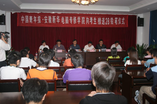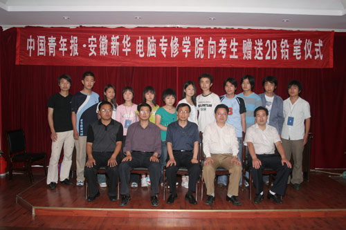 束开俊副院长在仪式上表示,新华教育秉承“兴教报国”的教育理念,希望通过赠送铅笔活动引起全社会对假2B铅笔危害的清醒认识,为教育事业提供一片蓝天净土。新华也将继续为教育事业的发展贡献自己的绵薄之力,并祝参加2006年高考和中考的考生取得优异成绩,升入理想学校,为父母、为安徽争光!黄山中学校长汪学龙代表黄山中学全体师生感谢新华电脑专修学院和中国青年报社对同学们的关怀,并接受所赠铅笔。赠送仪式后,参会代表与在场的同学合影留念。