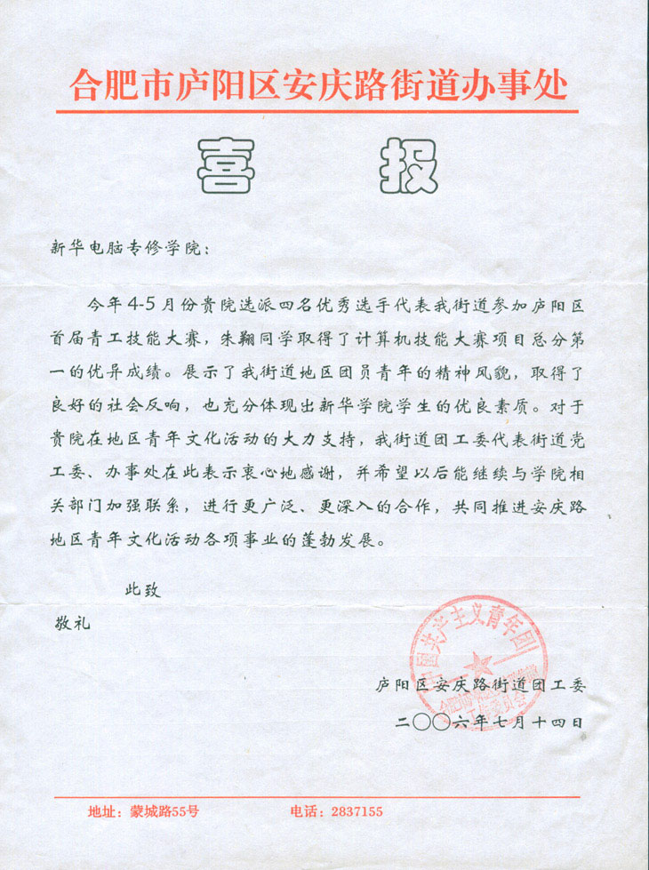 在前不久举办的合肥市庐阳区首届青年职工技能大赛中,我院朱翔同学在计算机技能大赛中与众多高手同台竞技,取得项目总分第一的优异成绩,获得各界的高度评价,体现了新华学生的优秀素质。