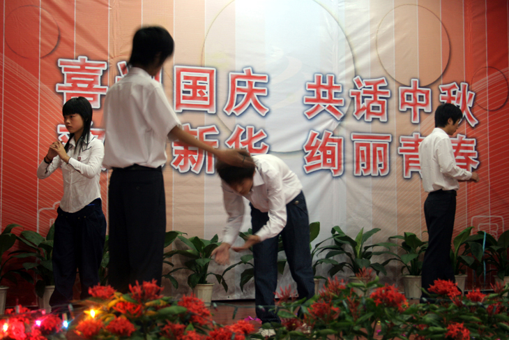 本场晚会全部由学生自己控制,从前期的节目挑选、现场布置到后期的演员化妆、灯光和声音效果等,凝聚了晚会所有演职人员的心血,他们从不会到会,一点点摸索着前进,向祖国母亲献上了一场精彩的文艺晚会。