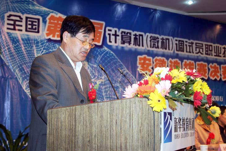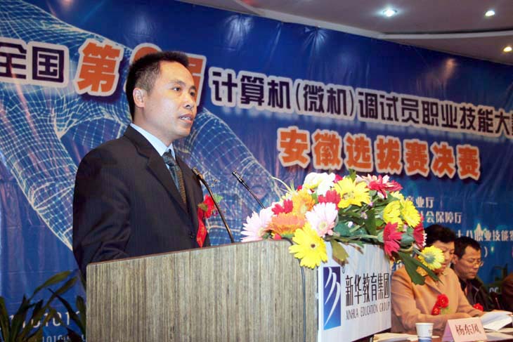 新华电脑专修学院副院长杨东风在第二届全国计算机调试员职业技能大赛安徽区决赛上讲话