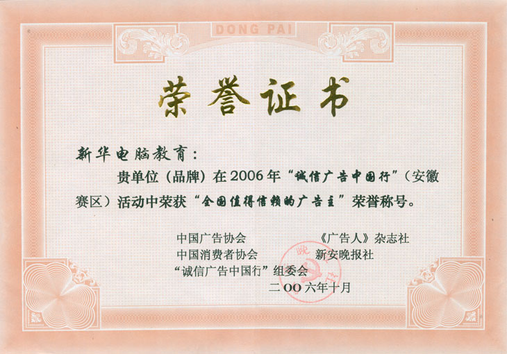 2006年“诚信中国广告行”活动由中国广告协会联合全国百家知名媒体共同组织,是为了促进中国广告事业的健康发展,保护知名品牌成长壮大,建立良好规范的市场秩序,倡导诚信经营,共建和谐社会的需要而产生的,安徽赛区由《新安晚报》承办,在历时三个多月的媒体推荐、受众投票等组织活动中,新华电脑教育脱颖而出,以绝对优势的全国大众投票数,和中国移动、华润置地(合肥)有限公司、东风本田汽车等企业一起成功入围。