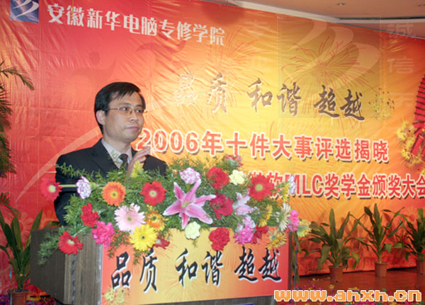 安徽新华电脑专修学院常务副院长苏凯钧在大会致辞中说, 2006年对于新华教育集团来说是品质教育的一年,是硕果不断的一年,更是辉煌的一年!在过去的一年中,新华电脑教育正式入驻北京中关村,率先在行业内推出教育品质化要求;连续四年被评为“国家信息化教育全国示范教育基地”;被新浪网、搜狐网和《中国青年报》、《中国教育报》等知媒体评为“2006年度十大影响中国IT教育机构”和“最具就业竞争力20强职业院校”;安徽新华电脑专修学院承办和组织教师参加全国计算机职业技能大赛并载誉而归、首家在北京中关村建立软件人才“实训工场”;“亚洲职业教育发展论坛”新华发展模式成为与会者关注和研究的焦点……在过去的一年中,中国IT教育全面质量管理体系——新华521培英计划全面实施,开创电脑教育品质化新时代;毕业生就业安置率位居行业前列并获中国就业促进会、中国职工教育与职业培训学会会长林用三高度评价。所有这些成就都是与政府各级领导和社会各界的支持分不开的,也是全体新华人团结奋进、锐意进取的价值呈现。