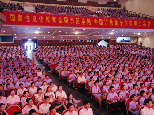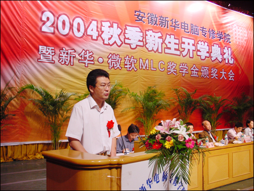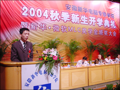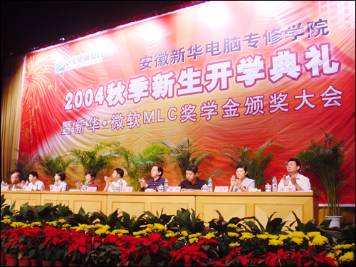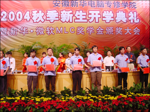 9月21日,位于省城合肥市的安徽大剧院广场彩旗飘扬,处处洋溢着一派热烈的气氛。安徽新华电脑专修学院“2004年秋季新生开学典礼暨新华?微软MLC奖学金颁奖大会”在这里隆重举行。2000多名新生代表参加典礼仪式。安徽省人大常委会副主任朱维芳、共青团安徽省委副书记王虹、省信息产业厅副厅长吴晓明、省电子行业职业技能鉴定指导中心所长王爱华、微软(中国区)MLC教学发展中心总经理李秦、苹果公司中国区培训总监张瓒、新华电脑专修学院院长沙旭等出席典礼并发表了讲话。典礼上, 61名新华学子在8月份的奖学金评选中脱颖而出,获得了由新华教育集团与微软MLC共同颁发的获奖证书和2000-500元不等的奖学金,并现场接受了颁奖。