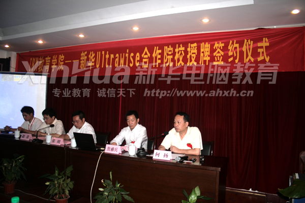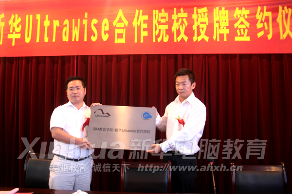Ultrawise公司副总经理焦雅兵与安徽新华电脑专修学院院长张明共同签署、交换了《校企共建“IBM教育学院-新华Ultrawise合作院校”协议书》并揭牌,此举标志着新华电脑教育领域向国际化、专业化方面的又一次重大突破。
