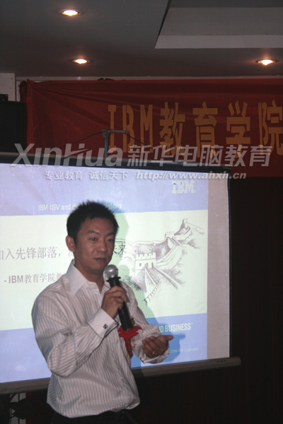 何扬总监从办学实力、专业体系、师资力量、就业保障四个方面详细介绍了学院的整体情况。安徽新华电脑专修学院隶属于新华教育集团,始终坚持“新华教育,兴教报国”的办学理念,已为社会培养40万优秀IT人才;学院现拥有“365国家紧缺型人才培养计划”和“TC精英教育”两大专业体系;在北京、上海、杭州、广州等地设立了20多家就业办事处,并先后与海尔集团、新浪集团等40000多家用人单位建立了长期协议用人关系,形成了覆盖全国的毕业生就业网络。他表示,IBM教育学院作为一项培养软件人才的创新性计划,新华电脑教育作为中国IT教育第一品牌,双方的合作可谓是强强联合,有了首次的成功合作,今后也一定会取得更好的合作成果。