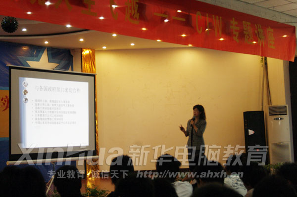 4月28 日,安徽新华电脑专修学院第五届校园数字文化节闭幕暨颁奖晚会成功举办。各类活动不仅受到全体师生的一致欢迎与积极参与,更受到了社会各界的广泛关注。为了普及网络安全知识、增进同学们对网络的了解、激发同学们对网络知识的兴趣。4月29日,学院特邀请出席闭幕式晚会的Vcampas公司中国区域总经理郑欣女士在365西校区为同学们举行了“打造顶级专业 实现人生飞越”CIW专业讲座,主要内容涉及网络安全、CIW认证体系。
