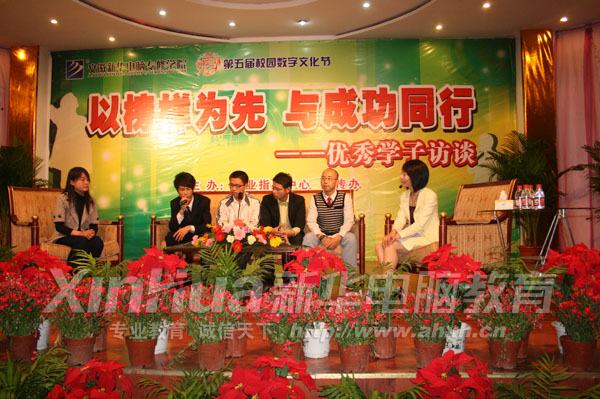 4月25日上午9时,一场名为“以榜样为先,与成功同行”为主题的优秀学子访谈活动在365西区多功能厅举办。陈磊、汤玉泉、王修彬、高二敏、李雨健五位成功学子与现场400名新华学生分享成功心得、回顾求学故事。安徽新华电脑专修学院张明院长、束开俊副院长与各校区负责人也出席了本次活动。
