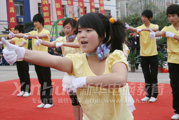 为以实际行动宣传中博会、为安徽发展加油,安徽新华电脑专修学院特开展“文明礼貌月”活动,其中手语操大赛最受学子欢迎。4月16日下午 “精彩中博 魅力新华”手语操决赛活动在新华西区操场隆重举行,身着统一服装的学子们动作有力、整齐规范,不时变化的队形体现无限创意。队员们眼神闪烁光芒、面带微笑,自信与青春活力展现无遗。