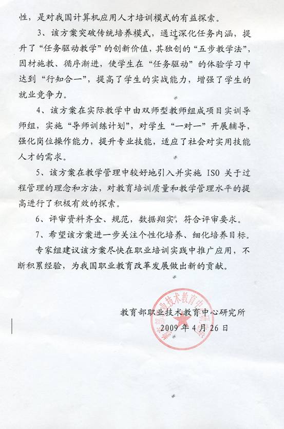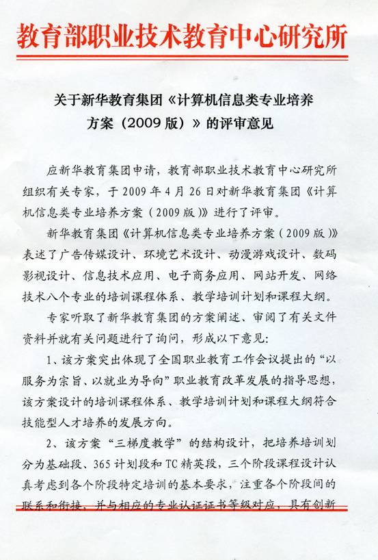 应新华教育集团申请,教育部职业技术教育中心研究所组织有关专家,于2009年4月26日对新华教育集团《计算机信息类专业培养方案(2009版)》进行了评审。