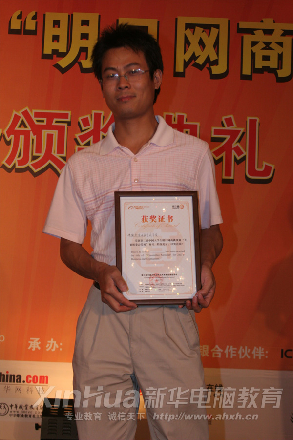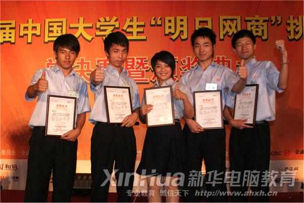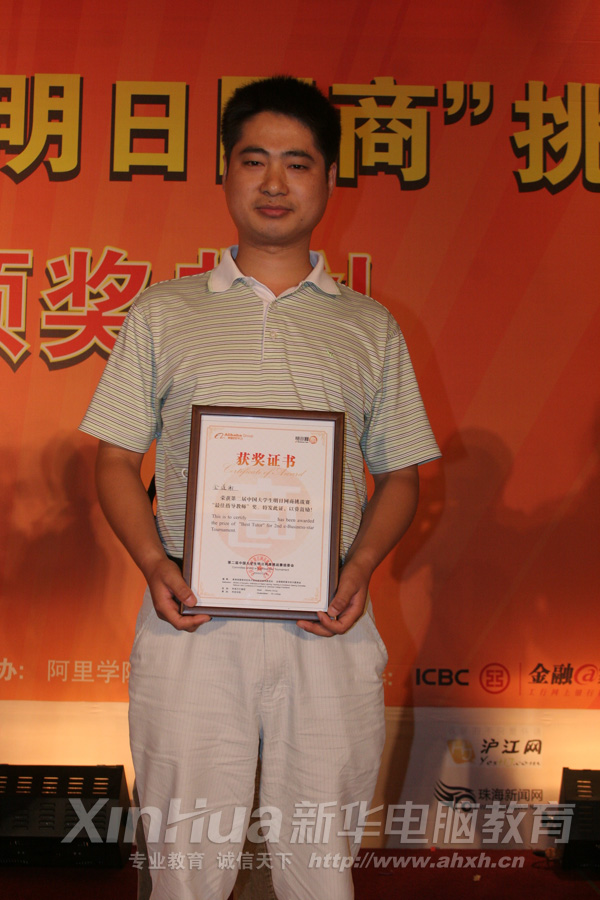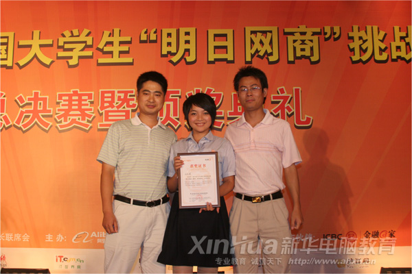 新华杭州讯:7月24日,倍受关注的第二届全国大学生“明日网商”挑战赛总决赛暨颁奖典礼在杭州隆重举行。在此次大赛中,安徽新华电脑专修学院喜获六项大奖。汪云娟同学获得“明日网商”挑战赛铜奖、“校园十佳CEO”、“生活服务网络经纪人”三项大奖;金道谢老师荣获“最佳教师指导奖”、“最佳网络经纪人指导教师”;安徽新华电脑专修学院被评为“最佳组织奖”。