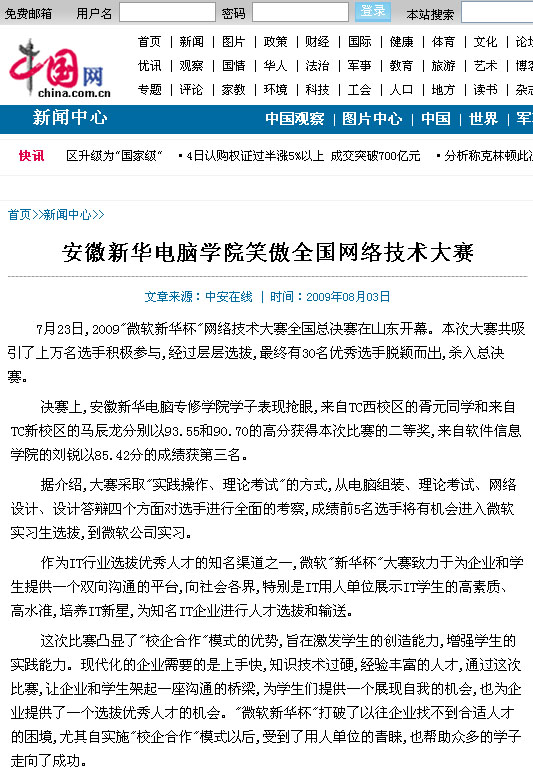 > 中国网报道安徽新华学子笑傲全国网络技术大赛
