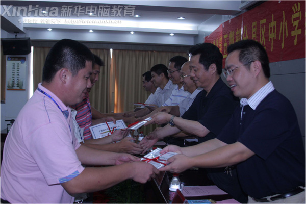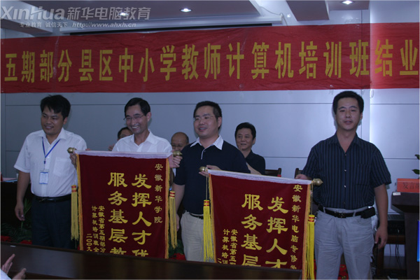 结业仪式上,省政协领导与新华的领导们共同为接受培训的120名教师办法结业证书,学员代表向安徽新华电脑专修学院、新华学院赠送锦旗,上面写着“服务基层教育、发挥人才优势”的字样,以表达对新华免费承办计算机培训、以教育方式回报社会的公益之心。