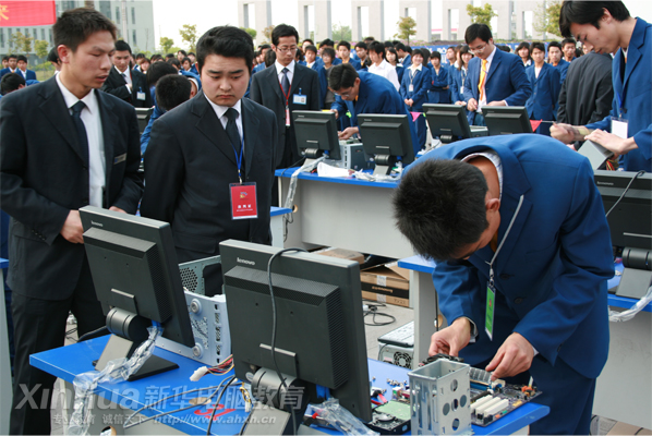 技能型IT人才是建设信息化国家的人才保障,安徽新华电脑专修学院为培养符合需要IT人才多管齐下,图为新华校园数字文化节计算机安装调试大赛现场。
