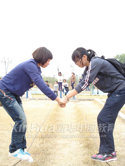 同学们乐此不疲地玩着每一个项目,“飞降”挑战着大家的心理素质;“爬网”考验着大家的耐力,“水上漫步”锻炼了大家的反应能力和敏捷度。在老师的指导下,大家分成了两组,进行游戏“同心协力”。就是两人为一小组,相互搀扶着走在两条平行的钢丝上。这个游不仅锻炼了大家的平衡能力,还增强了大家的合作精神和集体荣誉感。