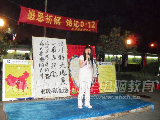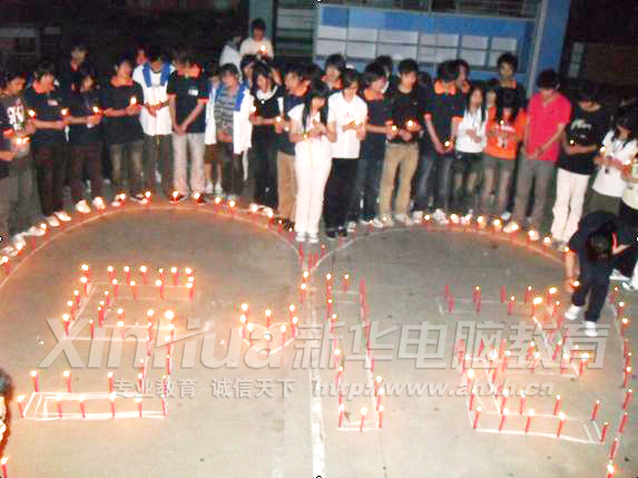 为悼念在5·12大地震中罹难的同胞们,5月12日,安徽新华电脑专修学院电子商务学生会在西区举办了汶川大地震悼念活动。此次悼念活动内容有两项:5月11号至5月12号通过摆展台和班级宣传,向全体新华师生征集他们对汶川的祝福;5月12号晚上8:00点燃心形蜡烛为汶川祈福,并通过感人的节目表达我们为汶川加油。参加活动的有365西校区的各兄弟社团、阿里巴巴定向培训班和若干班级,活动得到了校领导的大力支持。