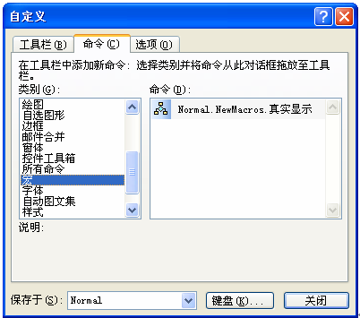 单击“工具”菜单,选择“自定义”命令,或者利用组合键Alt+V+T+C,调出工具栏“自定义”对话框,选择“命令”中的“宏”,右边的列表框中会显示出所有已经存在的宏。找到刚才编辑的那个“真实显示”的宏,将它拖入Word主界面的工具栏中的任意位置,这时工具栏中会出现一个与宏名对应的按钮,单击“关闭”按钮退出设置,如图1-3。