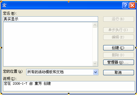 单击“工具”菜单栏,选择“宏”,再单击“宏”命令,或者直接利用组合键“Alt+F8”打开“宏”对话框,在“宏名”编辑框中输入一个宏名如“真实显示”,然后单击“创建”命令,打开Visual Basic编辑器,如图1-2。