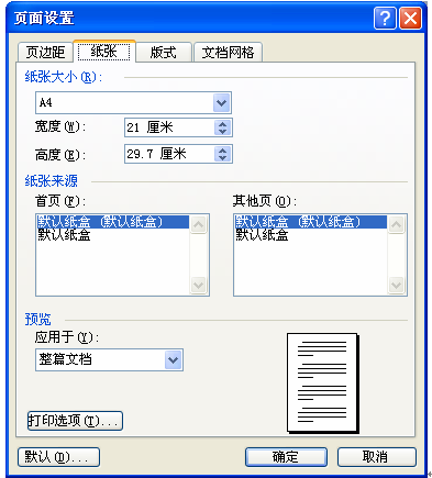 由于各人使用的显示器尺寸不同及画幅调整的习惯不同,因此在此无法给出一个固定的数据。请先将显示器的画幅调整妥当,以能够最大限度地显示出完整的全屏幕窗口为准。找一张A4纸,用尺子量下纸张的宽度,要求精确到毫米,因为标称为某种开本的纸张,其实际大小并不一定与标称值相同。然后,新建一个空白文档,单击“视图”菜单,选择“页面”,再单击“文件”菜单,选择“页面设置”,在“页面设置”对话框中将打印设置中的“纸型”设置为与准备的纸张相同的纸型,如在此为A4,再将“纸型”选项卡中的纸张宽度设置为与刚才量好的值完全一致,如图1-1,确定后返回编辑界面。