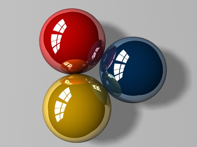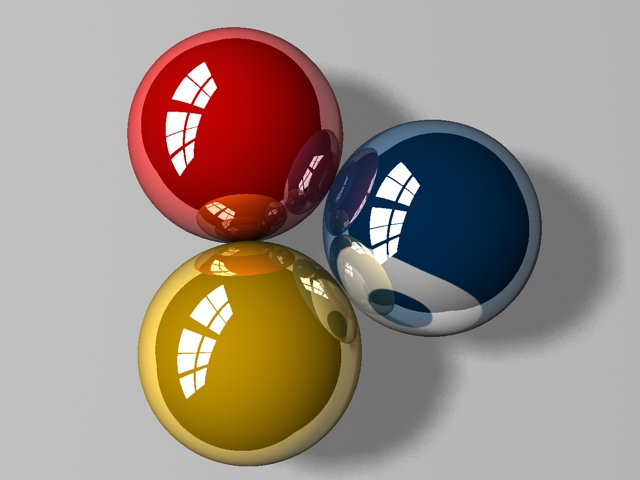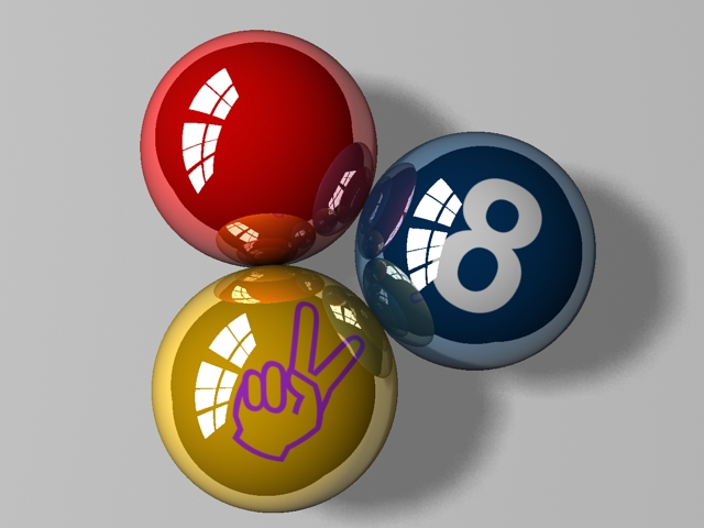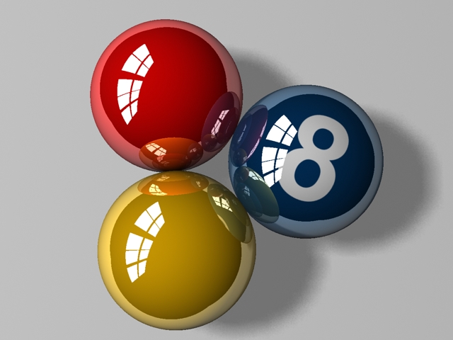 至此整个调节过程就完成了,其实最主要的就是贴图的创建方法及实现alpha通道有效的参数。最后用同样的手法我们对黄色球也贴了一个手形标志,其中手标志是由文字A通过修改字体方式为“Wingdings”而得到的,本例最终渲染结果如图8-11所示。
