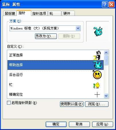 再依次单击“开始→设置→控制面板”,双击“鼠标”打开“鼠标属性”,从“指针”选项卡中点“浏览”按钮(图2),定位到上述文件夹中的鼠标指针文件并“确定”,就可拥有漂亮的鼠标指针啦。