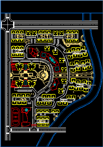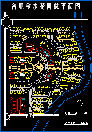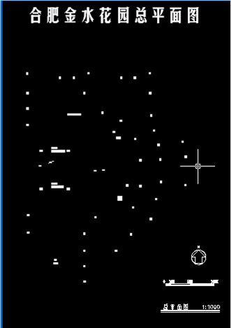 启动AutoCAD软件,打开合肥金水花园总平面图进行观察,并将图纸整理为整体框架层和文字说明层两层。把不需要的绿化和铺装等进行删除。如图01~图03所示。