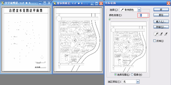 四、通过“选择”——“色彩范围”命令,分别将“整体图框层.TIF”和“文字说明层.TIF”的白色空白部分吸取得到选区(注:色彩范围的颜色容差设置为“0”,以免误选择到图框部分。),并按“Delete”删除。具体参数和结果如图04~图05所示。