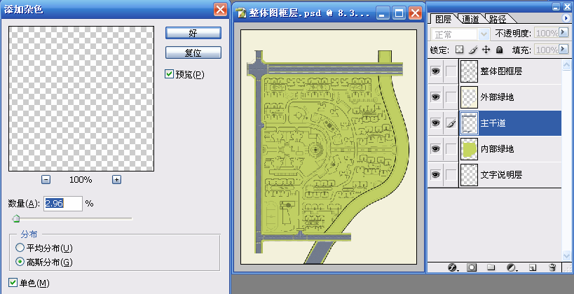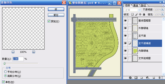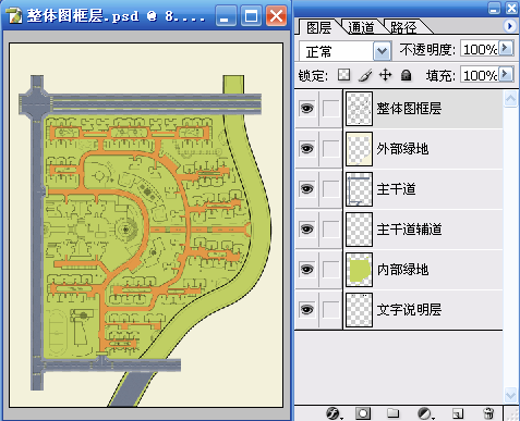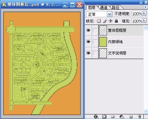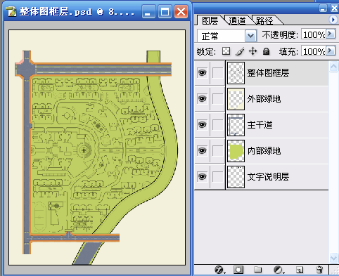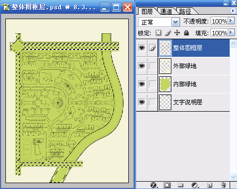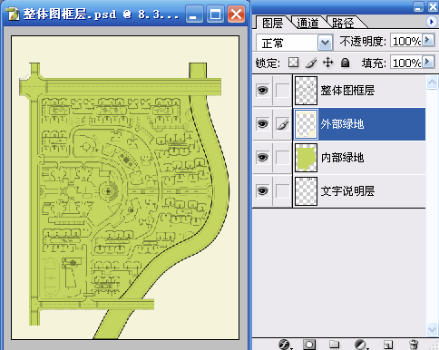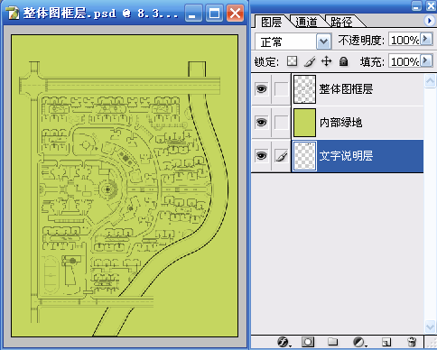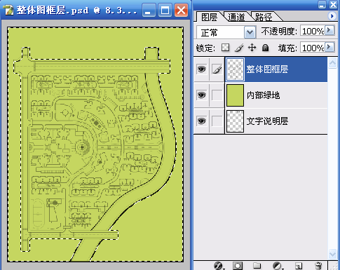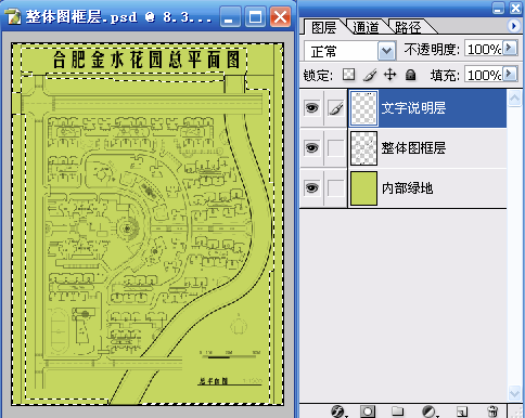 五、使用移动工具(V)将“文字说明层”移动到“整体图框层”的画布上来,新建图层命名为“内部绿地”层,并填充前景色(R:197 G:214 B:96)。结果如图06所示。