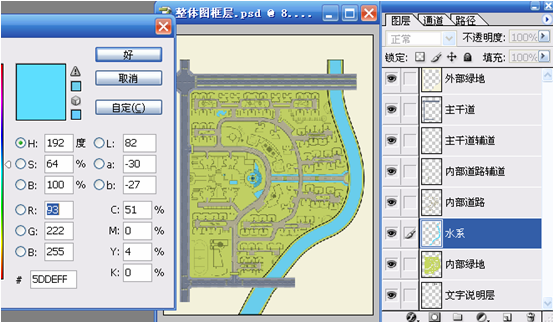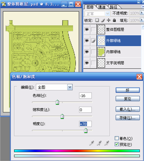 七、使用魔棒工具(W)在“整体图框层”选择主干道以外的区域,再利用快速蒙版(Q)的临时用红色着色功能进行检查,检查无误后再次按(Q)键退出快速蒙版,选择“内部绿地”层使用 “通过剪切的图层”命令(Ctrl+Shift+J)得到新图层,并命名为“外部绿地”。使用“色相/饱和度”命令(Ctrl+U)对“外部绿地”层进行色彩和明度的调整以便于和“内部绿地”层进行区分。具体参数和结果如图10~图13所示。