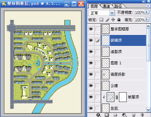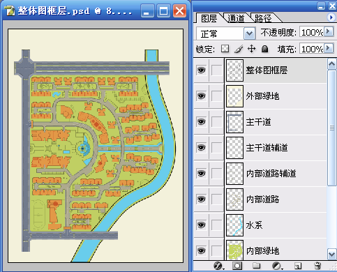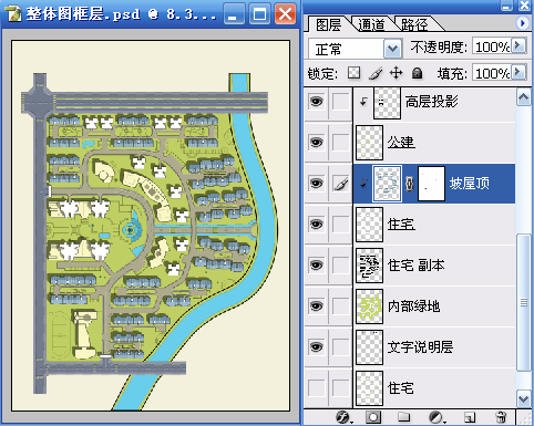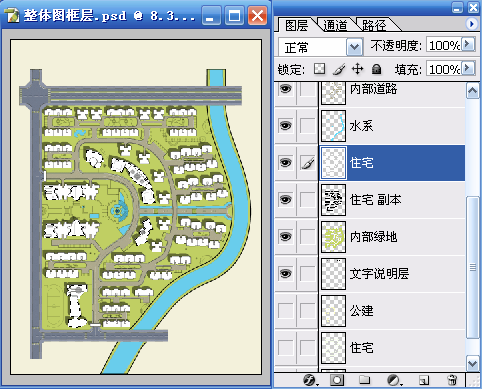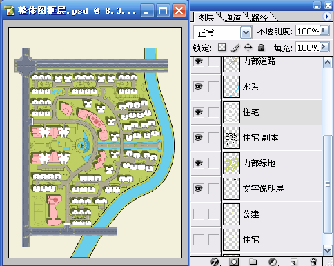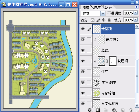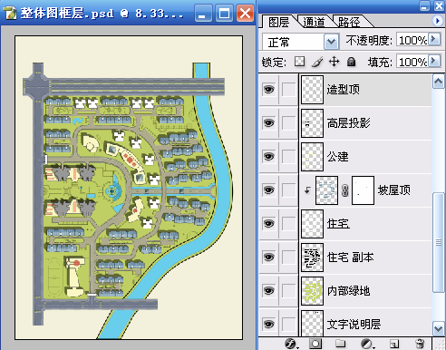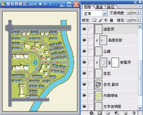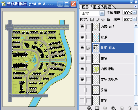 一、使用魔棒工具(W)在“整体图框层”选择建筑的区域,再利用快速蒙版(Q)的临时用红色着色功能进行检查,检查无误后再次按(Q)键退出快速蒙版,选择“内部绿地”使用 “通过剪切的图层”命令(Ctrl+Shift+J)得到新图层,并命名为“住宅”。使用“色相/饱和度”命令(Ctrl+U)对“住宅”层进行调整以便于和“内部绿地”进行区分。具体参数和结果如图01~图03所示。