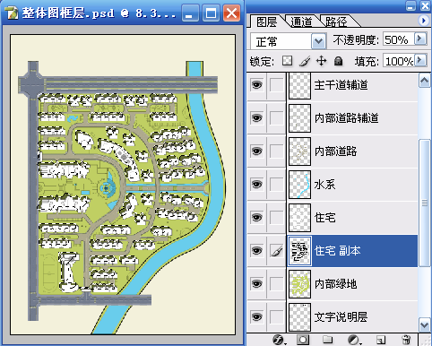 二、使用通过拷贝的图层(Ctrl+J)命令将“住宅”层拷贝出“住宅 副本”层,将“住宅 副本”层载入选区并填充黑色(R:0 G:0 B:0)作为住宅的投影,将“住宅 副本”层向下移动一层(Ctrl+【),再将其不透明图降低到50%,并使用移动工具(V)对其位置做适当调整。具体参数和结果如图04~图06所示。