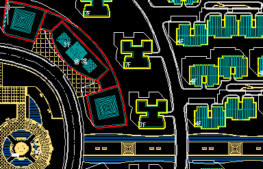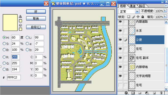 三、根据图纸显示的红色区域是公建和商业的部分,我们要将其与住宅的部分有所区分。使用魔棒工具(W)在“整体图框层”选择公建和商业部分的区域,再利用快速蒙版(Q)的临时用红色着色功能进行检查,检查无误后再次按(Q)键退出快速蒙版,选择“住宅”层使用 “通过剪切的图层”命令(Ctrl+Shift+J)得到新图层,并命名为“公建”层。并填充前景色(R:255 G:255 B:194)。具体参数和结果如图07~图09所示。