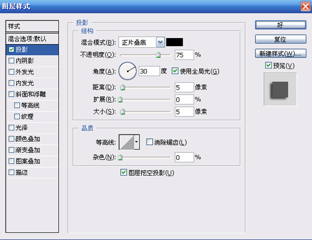 六、我们选择一个花草的素材,通过移动工具(V)配合矩形选框工具(M)让其在水系两边进行复制,为其命名为“花草3”并将其放在“花草2”层上一层。并给其添加一个投影的图层样式。具体参数和结果如图14~图16所示。