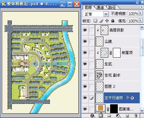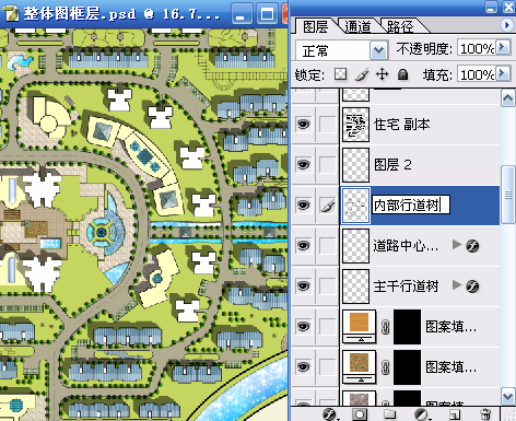 三、我们选择一个素材作为小区内部道路的行道树,通过移动工具(V)配合矩形选框工具(M)让其在同一图层小区内部道路两侧进行复制。并将其放在“道路中心绿化”层上一层。结果如图07~图08所示。