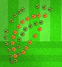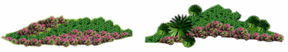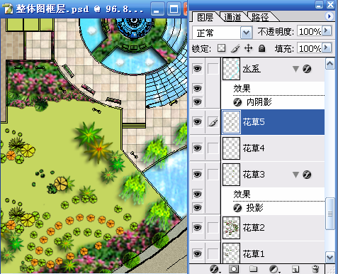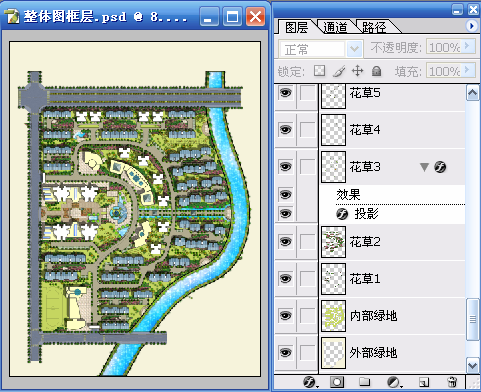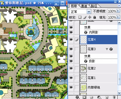 五、我们选择两个花草的素材,通过移动工具(V)配合矩形选框工具(M)让其在水系两边进行复制,为其命名为“花草1”和“花草2”并将其放在“内部绿地”层上一层以免覆盖了路面和铺地。具体参数和结果如图12~图13所示。