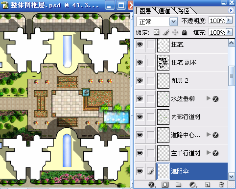 一、在细节美化的部分,我们看到这幅图中有商业的部分,我们选择用一个休闲遮阳伞的素材来营造一些商业氛围。通过移动工具(V)配合矩形选框工具(M)让其在商业门前的空地上有序的进行复制,为其命名为“遮阳伞”并将其放在铺地的上一层。具体参数和结果如图01~图02所示。
