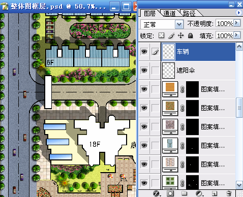 二、我们选择用一些车辆的素材将马路和停车位布置一下让场景更加丰富。通过移动工具(V)配合矩形选框工具( M)让其在主干道和小区停车位上有序的进行复制,为其命名为“车辆”并将其放在“遮阳伞”层的上一层。具体参数和结果如图03~图04所示。