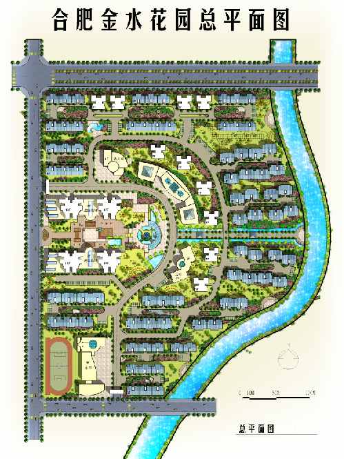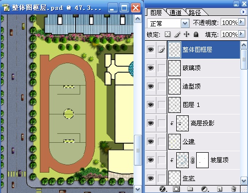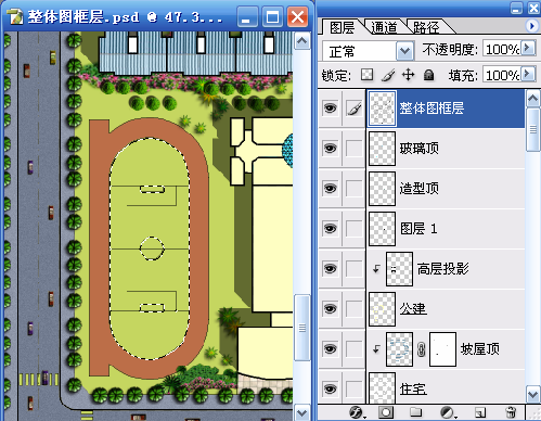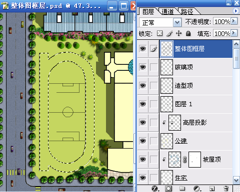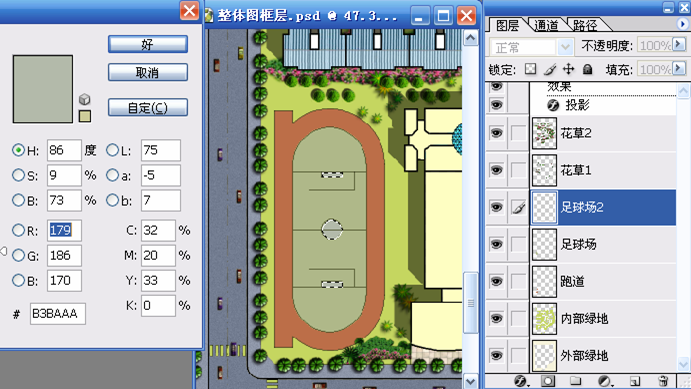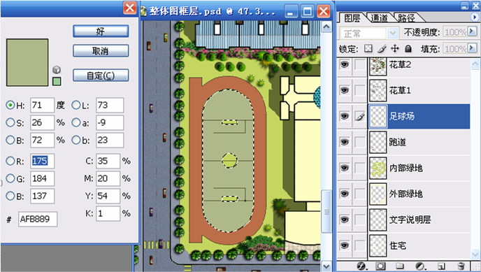 四、选择“整体图框层”层使用魔棒工具(W)选择足球场部分的选区,在“跑道”层上方新建“足球场”层和“足球场2”层,再将分别填充前景色(R:175 G:184 B:137)和前景色(R:179 G:186 B:170)。具体参数和结果如图07~图10所示。整张总平填色的效果制作完成了。