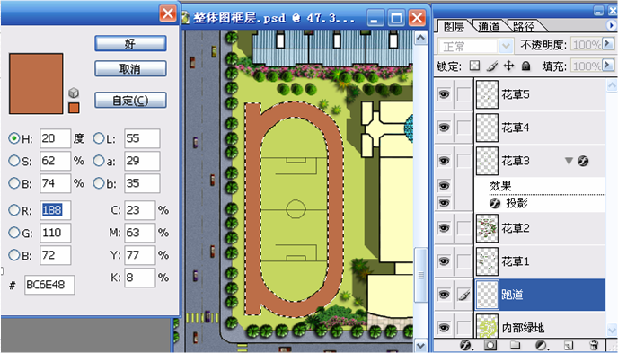 三、选择“整体图框层”层使用魔棒工具(W)选择跑道部分的选区,在“内部绿地”层上方新建“跑道”层,再将跑道选区填充前景色(R:188 G:110 B:72)。具体参数和结果如图05~图06所示。