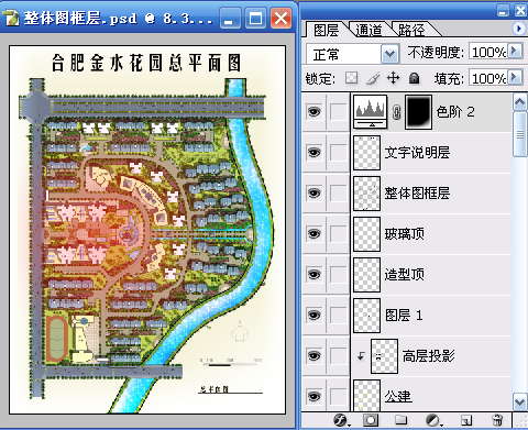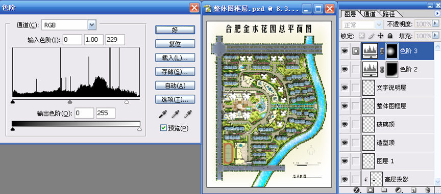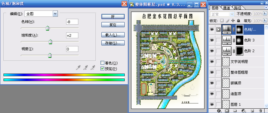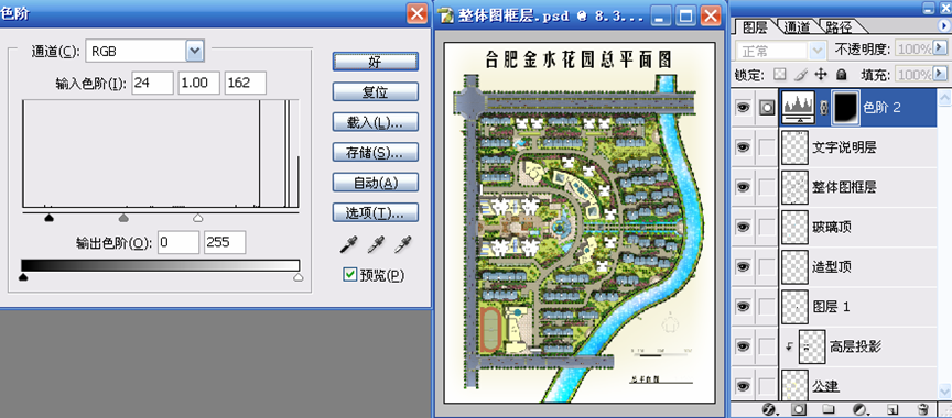 七、最后我们对中央景观组团做一些明度和纯度的变化,使其更加突出。利用快速蒙版(Q)和画笔工具(B)对中央景观组团涂抹填充,填充完成后再次按(Q)键退出快速蒙版得到选区,在顶层通过“图层”——“新调整图层”——“色阶”命令和“图层”——“新调整图层”——“色相\饱和度”命令添加“色阶”和“色相\饱和度”的调整层。具体参数和结果如图14~图17所示。