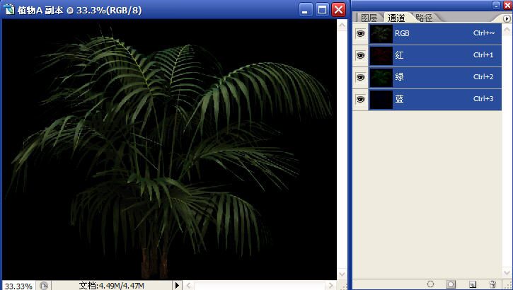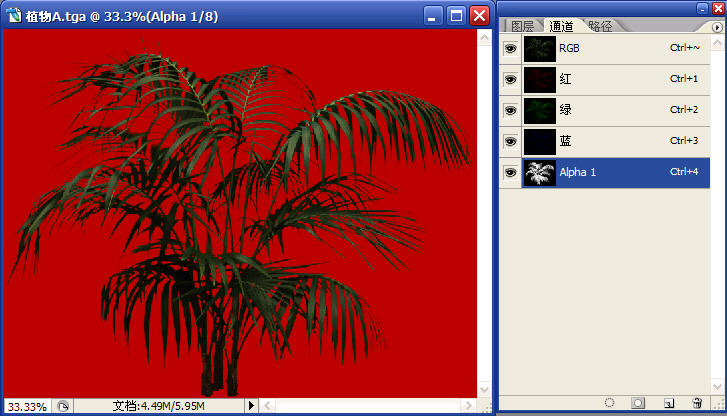 A.贴入的植物图片不能是普通的jpg图片,而必须是带有alpha通道的tga图,这种图片Lightscape识别起来最为流畅。关于将jpg图处理为带有alpha通道的tga图,这个过程比较简单由读者自行完成,这里我给出二张参考图说明两种图片的不同之处,希望读者处理起来务必注意通道的设置。