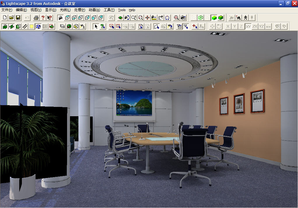 答:这可以说是光能传递的一个通病。不但在Lightscape中会出现这个问题,就是用3dsmax中的Radiosity引擎进行光传同样会产生贴图发飘,过粉的问题,只不过不同的表现平台解决之道不同而已,这里主要对Lightscape的方法进行一个探讨。我们打开一个光传完成的会议室场景,来研究一下这个问题的解决思路,场景如图18-6所示。