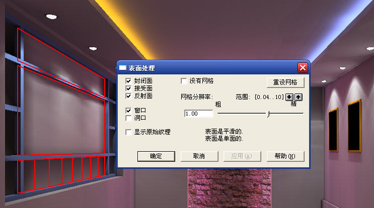 我们仔细的观察这张图片即可看出,由于左侧中间墙面的网格细分不够高,因此同样的光域网文件光路投射到其上并未产生如右侧墙壁清晰的光域网效果。其实解决之道很简单,只要将左墙的网格细分增加并重新执行光能传递就可以了。选择左侧墙面中间部分的表面,按照上节的方法打开其表面控制面板,它的原始细分参数如图19-2所示。