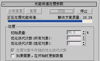 A.展开“光能传递处理参数”卷展栏,设置初始质量为85%,这个求解品质就可以理解为最终全局光照效果的精细程度。值越高,则光子反弹就越充分,场景的光线分布就越接近于真实的自然光反弹分布。但值得用户注意的是,它的品质与场景中的光照亮度无关。如果是你的灯光亮度不够,仅靠提高求解品质是不行的,必须更改灯光的光照强度并重新光传方可解决,这一点请大家务必注意。