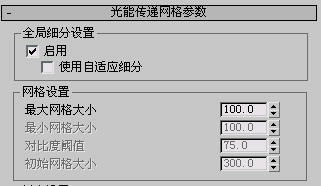 具体到我们上节所讲的案例,我们首先单击“光能传递处理参数”面板中的“全部重置”按钮,将上节我们光传的效果清除。然后再展开“光能传递网格参数”面板,勾选全局细分设置下的“启用”命令,取消“使用自适应细分”的命令,将“最大网格大小”值设为100,这样你场景中所有对象的表面它们的网格大小都是100个单位,如果你的系统单位是mm的话,那么基础网格大小就是100mm,全局网格细分参数如图15-1所示。
