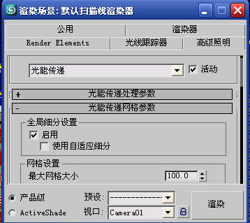 (1)首先,我们将以前的光能传递效果进行重置,这一步比较简单我就不细说了。重置之后场景又恢复到没有光能反弹分布的原始阶段,但我们必须设置全局网格细分,将最大网格大小设置为100,参数设置如图16-1所示。