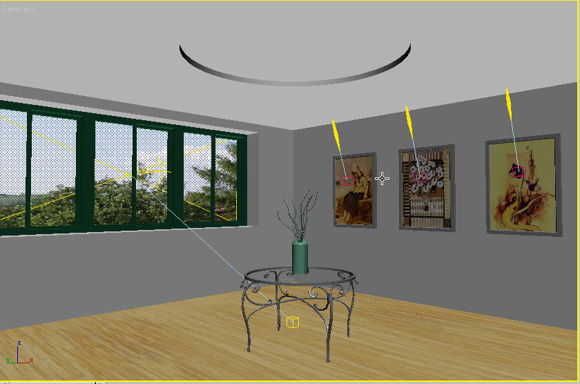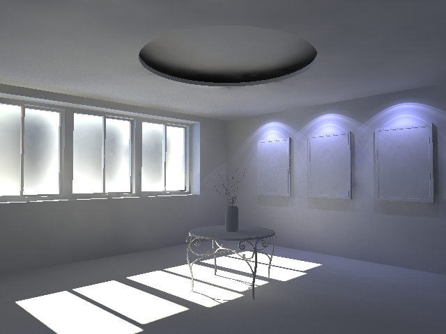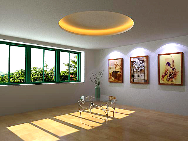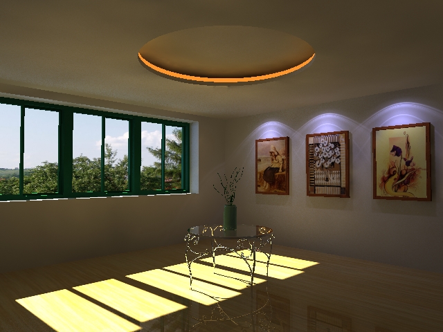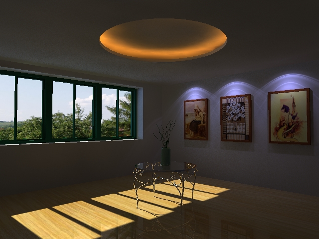 4.观察场景中的效果并不美观,地板材质出现了染色导致墙体变黄,并且太阳光又过于强烈,这部分内容前面我们已经介绍过了,这里我就不对修改过程一一指出了,由读者自行去完成。但是我们重点观察暗藏灯部位,发现效果并不明显,我们将亮度倍增打到2左右,并且按照第一节中所介绍的内容将渲染性保持,但关闭它在相机视图中的可见性,然后再测试一次,本次效果如图13-5所示。