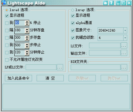 输出文件:将最终的解决文件按照用户指定的位置、名称进行成图渲染,格式只能是Lightscape事先设定的tga文件。右侧参数设定完毕之后,也要再执行一次“加入此条命令”以定义脚本,最终参数设置如图17-7所示。此时我们只要单击一次“执行bat”命令Lightscape就可以自动完成从光传到渲染的一整套流程了。
