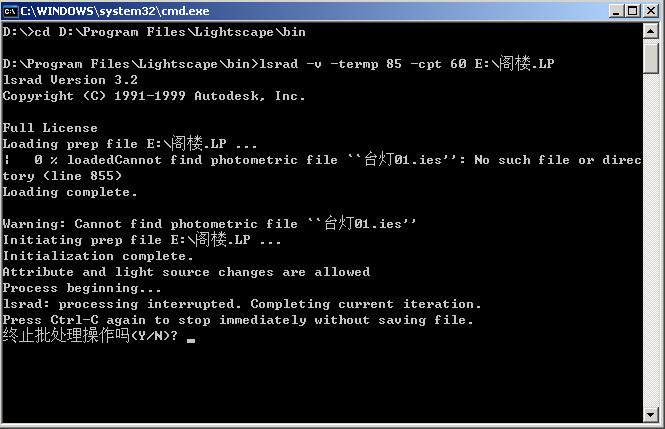 A: 以上设置完成之后,单击“执行”按钮,系统会打开一个MS-DOS窗口开始执行,如果在某个时候用户需要取消渲染过程,可以按一下Ctrl+C组合键来终止操作过程,根据需要选择yes or no,如图17-8所示。