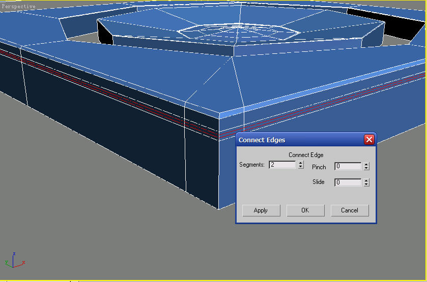 (5)激活“Edge”子级别,选择中间两条边中的任意一条连接它们的边,单击“Selection”卷展栏中的“Ring”按钮,选中中间两条边之间的所有边,再单击“Edit Edges”卷展栏中的“Connect”按钮右侧的对话框,在弹出的对话框中设置“Segments”为2,单击“Ok”按钮结束操作,结果如图26-8所示。